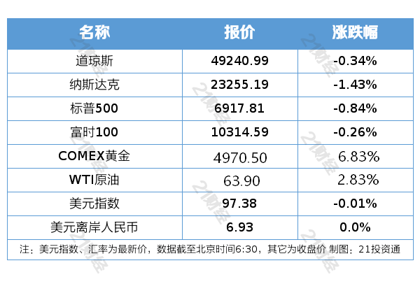 纽约股市三大股指2月3日下跌。截至当天收盘,道琼斯工业平均指数比前一交易日下跌166.67点,收于49240.99点,跌幅为0.34%;标准普尔500种股票指数下跌58.63点,收于6917.81点,跌幅为0.84%;纳斯达克综合指数下跌336.92点,收于23255.19点,跌幅为1.43%。