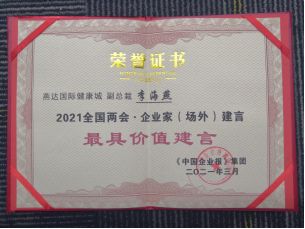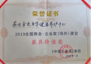 2019年3月18日,在《中国企业报》集团主办的2019全国两会企业家(场外)建言分享及颁奖活动暨企业家座谈会上,燕达金色年华健康养护中心荣获了“2019全国两会企业家(场外)建言最具价值奖”。