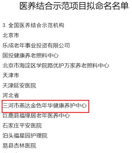 2019年12月,河北省卫生健康委、河北省民政厅联合发文,经各地推荐、资料审核、现场核查等程序,拟确定33家单位为全省首批医养结合优质服务单位,燕达金色年华健康养护中心上榜。