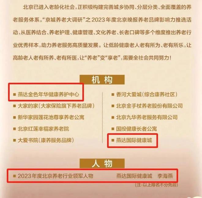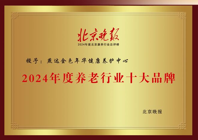 2024年12月25日,北京晚报公布燕达金色年华健康养护中心被评选为“2024年度养老行业十大品牌”。