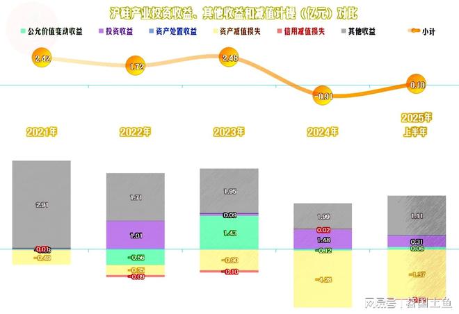 在其他收益方面,波动也是很大的,2023年及以前年度的大额净收益,是主营业务亏损时,当年仍能盈利的重要原因。2024年因为“资产减值损失”严重,出现了大额净损失,加剧了亏损。