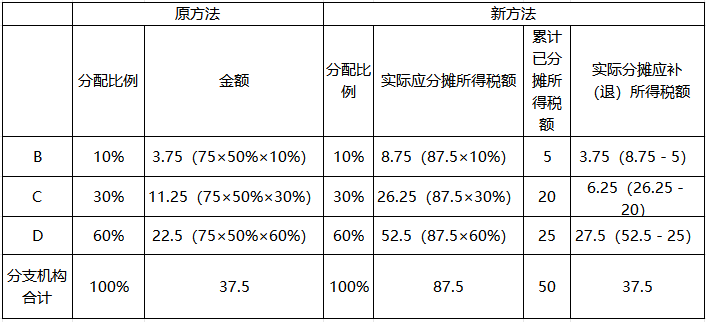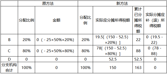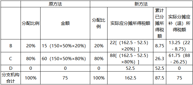 案例中,由于第二季度发现第一季度C、D分支机构分配比例计算错误,在第二季度申报时按照新方法计算的C分支机构应补税额比原方法少5万元;D分支机构应补税额比原方法多5万元;B分支机构分配比例没有错误,两种方法计算结果一致。D分支机构注销后,需重新计算分配比例,在第三季度申报时按照新方法计算的B分支机构应补税额比原方法少1.75万元,C分支机构应补税额比原方法多1.75万元。